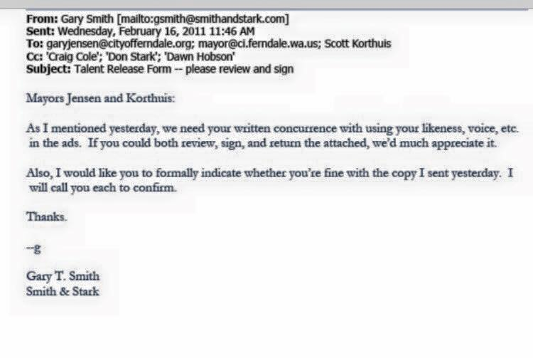 In that February 15 email, Gary Smith asked mayors Jensen and Korthuis for their approval on the final copy for a GPT print ad which was slated to run on February 20, 2011, in The Bellingham Herald, and for the mayors’ approval on the final copy for the GPT radio ad which would run that week as well.