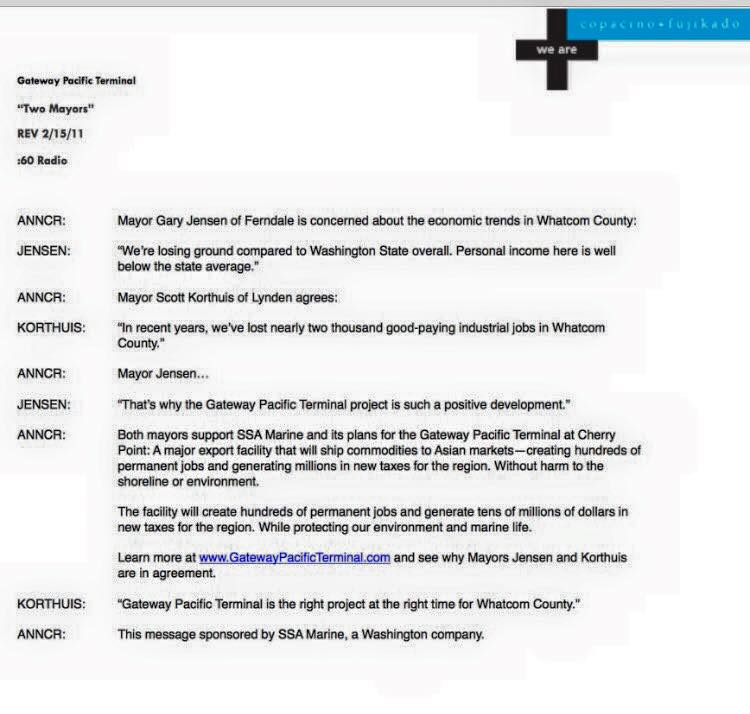 According to the copy for the radio ad that featured mayors Jensen and Korthuis, after each of them spoke a couple of lines in support of GPT, the script for the announcer in the radio spot read, “Both mayors support SSA Marine and its plans for the Gateway Pacific Terminal at Cherry Point: A major export facility that will ship commodities to Asian markets—creating hundreds of permanent jobs and generating millions in new taxes for the region. Without harm to the shoreline or environment.”