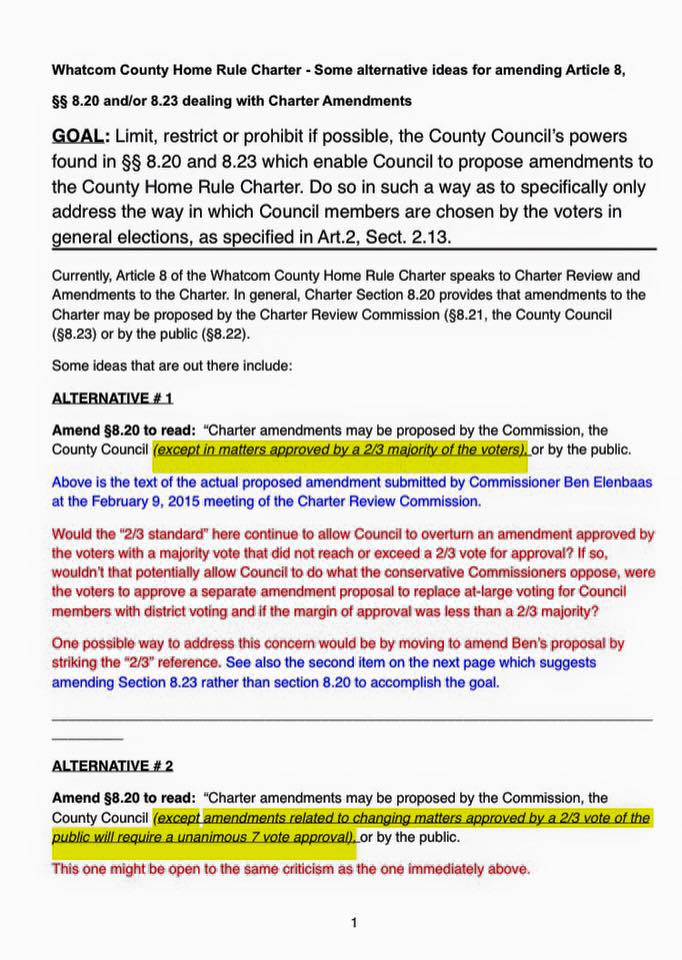 So, if they already had this concept in mid-February, why did the conservative commission majority wait until the very last minute of the Charter Review process to then revise the language in amendments 3 and 10 (now called propositions 2 and 3)? Because, it is my understanding that the commission had been advised by the county attorney a number of months earlier in the Charter process, about the likelihood that amendments 3 and 10 conflicted with the WA State constitution.