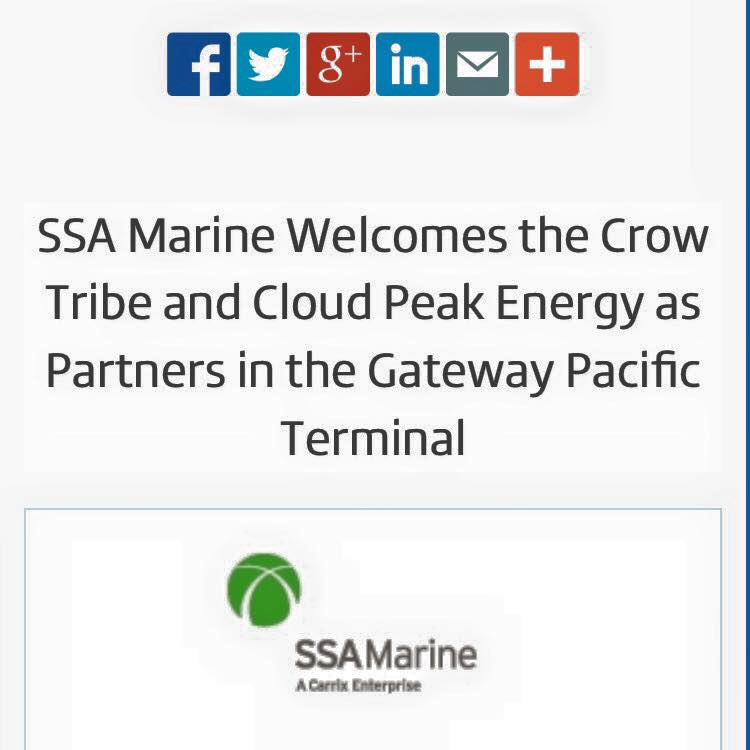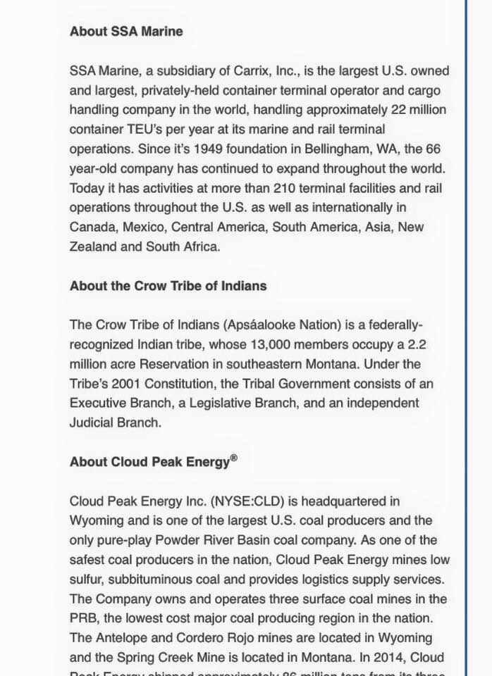 2) SSA Marine’s Bob Watters puts the Crow Tribe first in his quote, calling the Crow Tribe a partner even though at this point, the Crow has nothing more than an “option” with Cloud Peak.