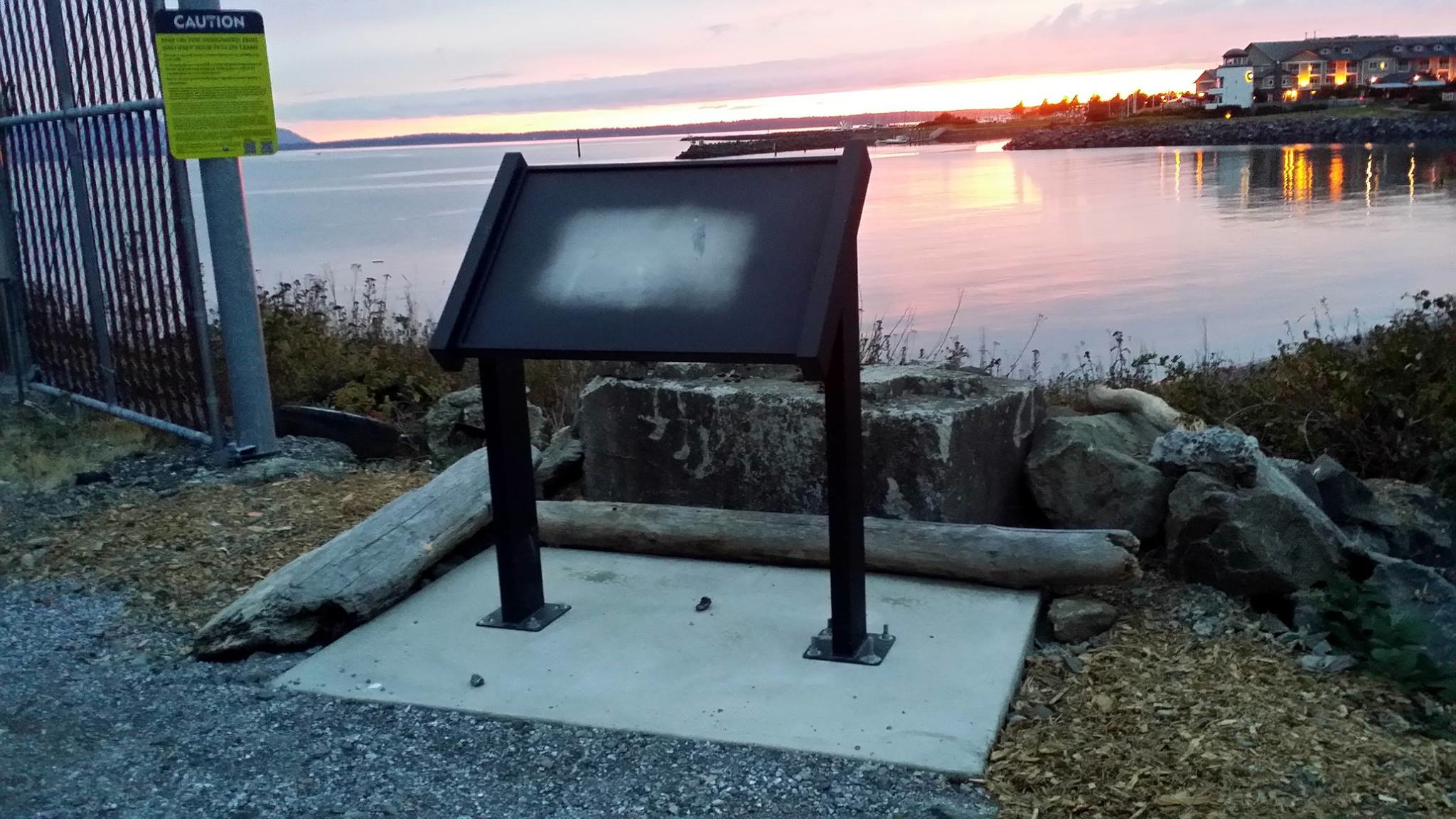 Buffer and riparian area vegetation was torn out and replaced with wood chips. There is the nice, large educational sign, which is the mitigation for human impacts (it will tell people that the area they are trampling contains forage fish and threatened marine animals). It will be pasted on a steel platform secured by a big piece of impervious cement right above the steep slope down the beach, which now is devoid of vegetation. And how about that new handrail on the second set of stairs nearer to the water? Blends in beautifully, huh?