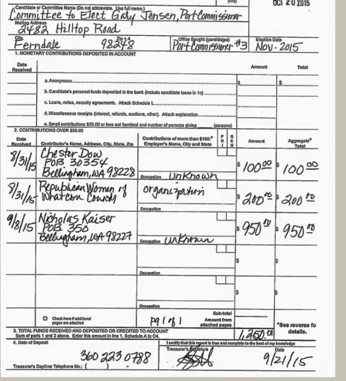 $600 on 9/28/15 from Whatcom County Republican Party PAC. So far, Whatcom Republican PAC has contributed $1,850 to Gary Jensen’s Port campaign. GPT applicant Pacific International Terminal/SSA Marine has, so far, contributed approx. $45,000 to the Whatcom Republican PAC in this 2015 election.
