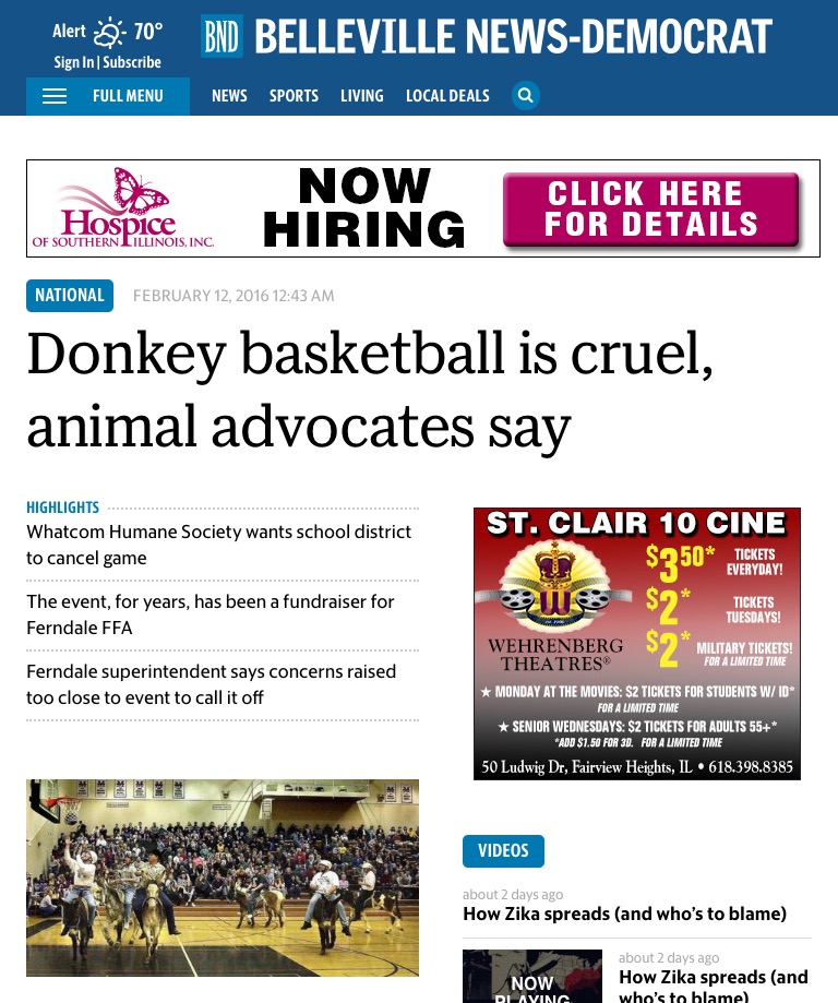 Belleville News-Democrat donkey Published February 19, 2016 at 768 × 919 in The Power of your Voice: Ferndale Donkey Basketball Controversy is Delivered across the Nation / Noisy Waters Northwest ← Previous Next →