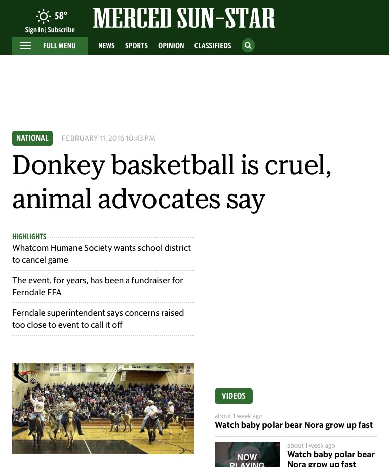 Merced Sun-Star donkey Published February 19, 2016 at 768 × 922 in The Power of your Voice: Ferndale Donkey Basketball Controversy is Delivered across the Nation / Noisy Waters Northwest ← Previous Next →