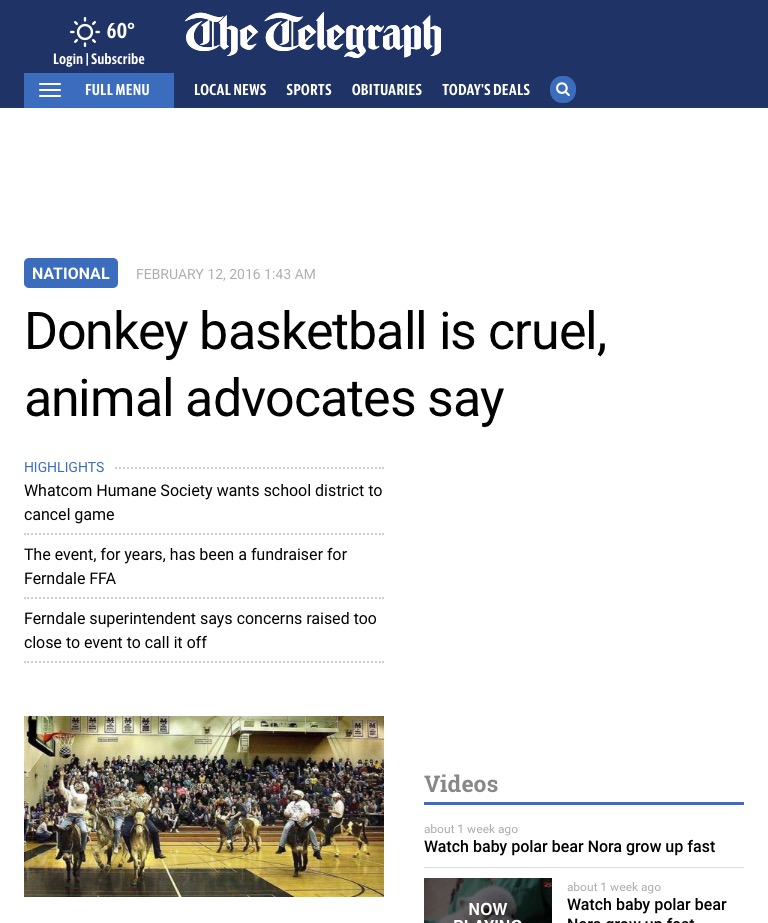 Telegraph donkey Published February 19, 2016 at 768 × 923 in The Power of your Voice: Ferndale Donkey Basketball Controversy is Delivered across the Nation / Noisy Waters Northwest ← Previous Next →