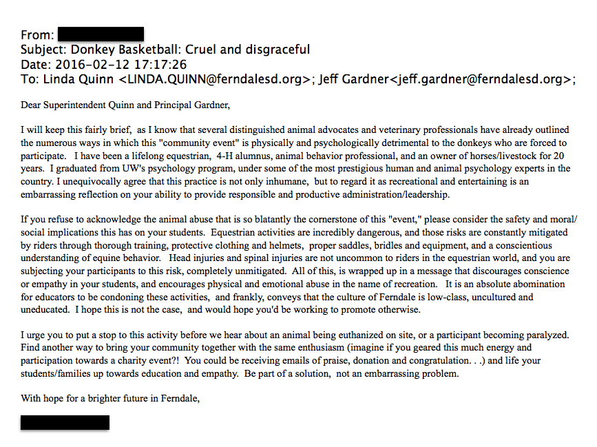 4 H alumnus equestrian animal behavior Published April 22, 2016 at 867 × 649 in Was more diligence due for students and donkeys? Following up on the February 13, 2016 Ferndale Donkey Basketball Event / Sandy Robson ← Previous Next →