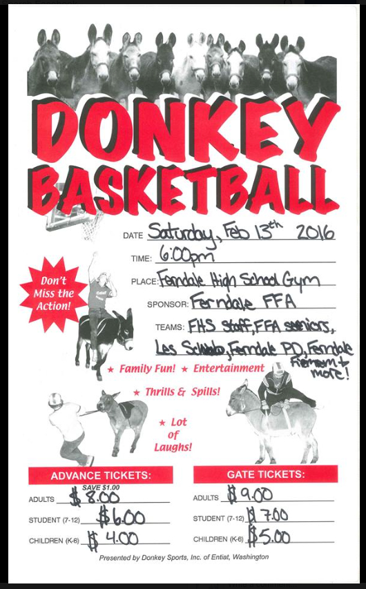 donkey bball poster Published April 21, 2016 at 530 × 853 in Was more diligence due for students and donkeys? Following up on the February 13, 2016 Ferndale Donkey Basketball Event / Sandy Robson ← Previous Next →