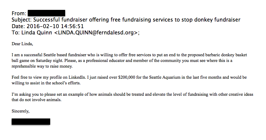fundraiser Published April 22, 2016 at 890 × 468 in Was more diligence due for students and donkeys? Following up on the February 13, 2016 Ferndale Donkey Basketball Event / Sandy Robson ← Previous Next →