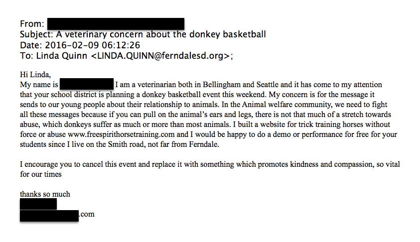 veterinary concern Published April 23, 2016 at 843 × 486 in Was more diligence due for students and donkeys? Following up on the February 13, 2016 Ferndale Donkey Basketball Event / Sandy Robson ← Previous