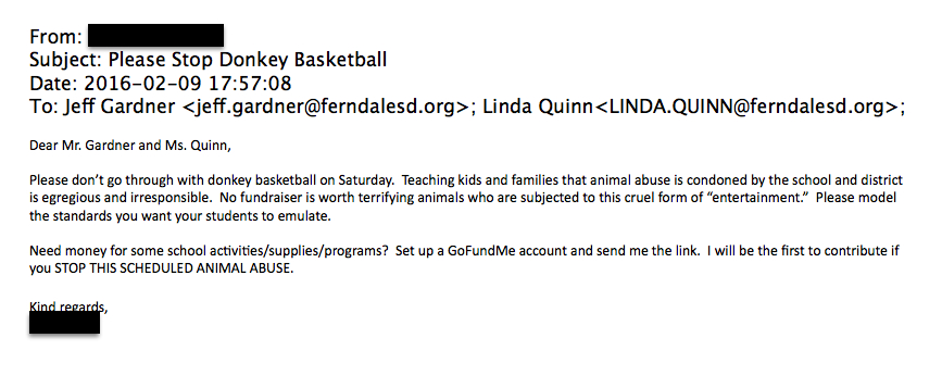 will contribute Published April 22, 2016 at 867 × 357 in Was more diligence due for students and donkeys? Following up on the February 13, 2016 Ferndale Donkey Basketball Event / Sandy Robson ← Previous Next →