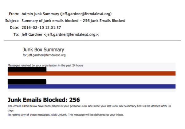 gardner 256 emails blocked Published April 24, 2016 at 602 × 420 in Additional Ferndale Schools donkey basketball records info: Junk Mail / Noisy Waters Northwest ← Previous Next → Header from Principal Gardner’s Junk email summary