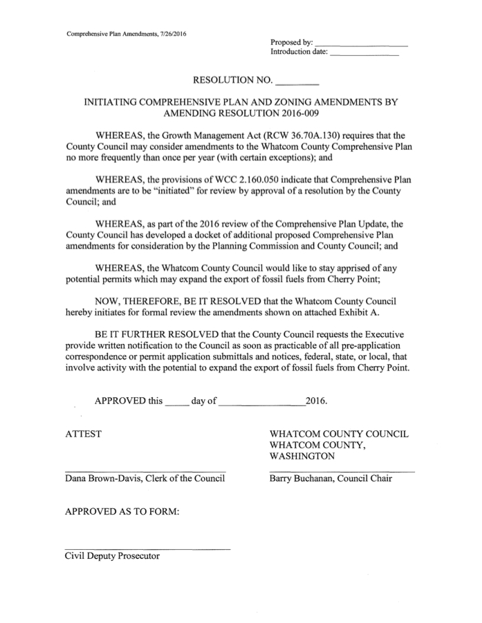 On Tuesday, July 26, 2016, Whatcom County Council members met for their Special Committee of the Whole (SCOTW) meeting at 1:30 that afternoon and their regular county council meeting at 7 p.m. At those meetings the council discussed the resolution (left) to send County Council Member Carl Weimer’s amendments to Chapter 2 Land Use regarding Cherry Point UGA to the Whatcom Planning Commission for further review.