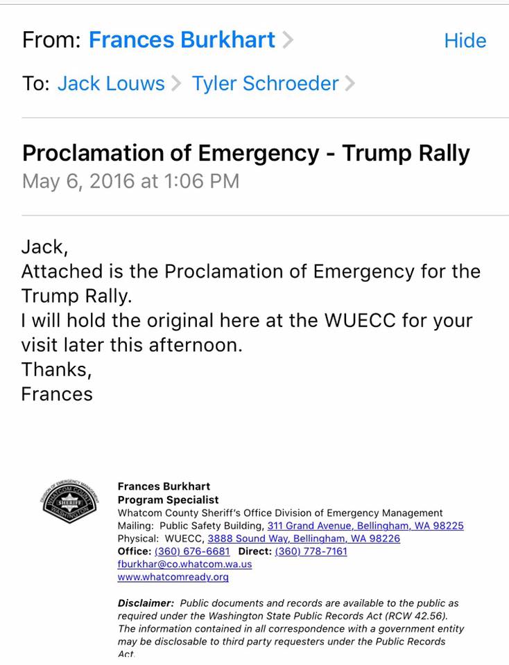 14054112_1267727106594536_5484660555036373678_n Published August 18, 2016 at 734 × 960 in A “Proclamation of Emergency” was considered for May 2016 Trump rally in Lynden / Facebook post, Sj Robson ← Previous Next → Selected email from Whatcom County personnel regarding Proclamation of Emergency for the May 2016 Lynden Trump Rally
