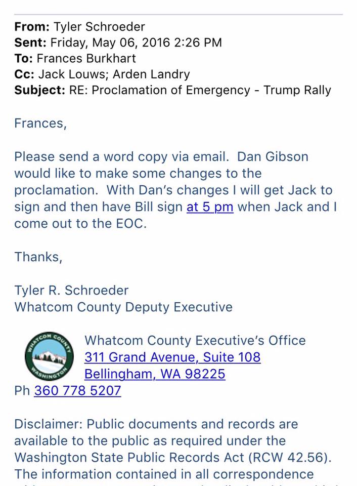 14055200_1267727139927866_1862555356141970542_n Published August 18, 2016 at 706 × 960 in A “Proclamation of Emergency” was considered for May 2016 Trump rally in Lynden / Facebook post, Sj Robson ← Previous Next → Selected email from Whatcom County personnel regarding Proclamation of Emergency for the May 2016 Lynden Trump Rally