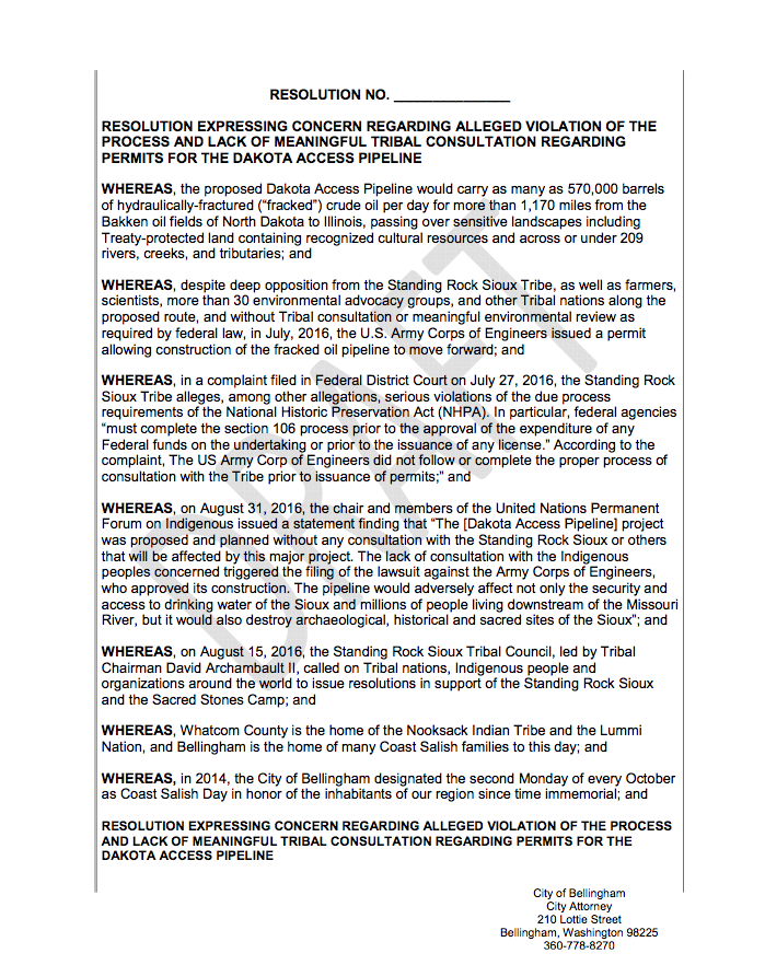 I remind you that also on September 12, 2016 the Bellingham City Council signed a “RESOLUTION EXPRESSING CONCERN REGARDING ALLEGED VIOLATIONS OF DUE PROCESS AND LACK OF MEANINGFUL TRIBAL CONSULTATION REGARDING PERMITS FOR THE DAKOTA ACCESS PIPELINE.” (A copy of the draft resolution is attached.)