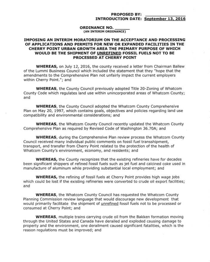 Public Hearing on this ordinance will be held Tuesday, September 27, 2016 at 7 p.m. at 311 Grand Ave., Bellingham. You can view the resolution on the Whatcom County website at this link: http://whatcomcounty.us/DocumentCenter/View/21171