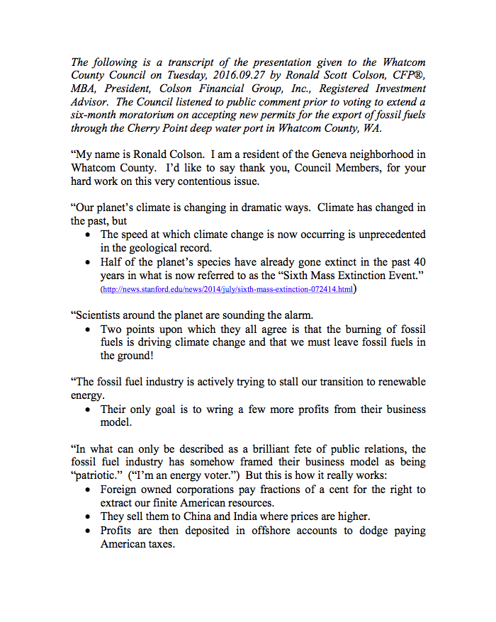 rons-comment-moratorium Published September 29, 2016 at 700 × 878 in Transcript of Ron Colson’s comment at the 9/27/16 Public Hearing on the Interim Moratorium on unrefined Fossil Fuel facility expansion at Cherry Point / Facebook post, Coal Stop ← Previous Next → http://www.colsonfinancial.com/sites/default/files/users/colsonfinancial/pdf/September%2027%2C%202016%20Presentation.pdf