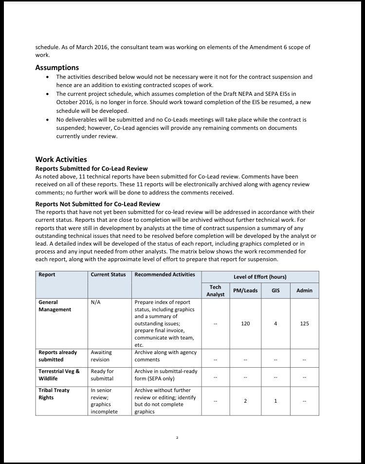 Screenshot photo of page 2 of an April 15, 2016 letter from CH2M Hill Project Manager Craig Lenhart, and Parametrix Technical Manager Jenifer Young, sent to Whatcom County Deputy Executive Tyler Schroeder (Whatcom County is an EIS Co-Lead agency for the GPT project), with the proposed GPT Contract Suspension Work Plan.