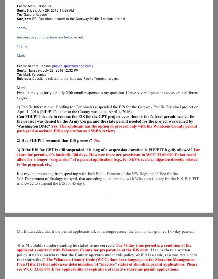 email-from-personius-on-gpt-contract-suspension Published October 19, 2016 at 750 × 958 in A way for Whatcom County to expire PIT’s permit application for the proposed GPT project / Facebook post, Sj Robson Next → July 28, 2016 email from Whatcom County PDS Assistant Director Mark Personius to Sandy Robson answering a series of questions she asked about the GPT EIS preparation contract extension