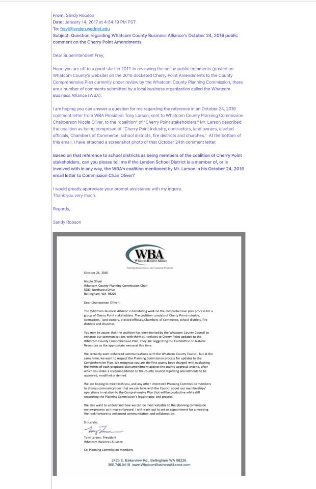 It struck me as odd that there would be school districts, fire districts and churches as part of the coalition, so I was curious about that. I contacted the local school districts’ superintendents, via email, asking them if, in fact, their school districts were involved with the Cherry Point coalition as Mr. Larson’s October 24, 2016 letter had stated was the case. (I have attached a screenshot photo of the January 14, 2017 email letter I sent to Lynden School District Superintendent Jim Frey). I sent essentially the same letter to Blaine School District Superintendent Ron Spanjer, Ferndale School District Superintendent Linda Quinn, and Bellingham School District Superintendent Greg Baker.