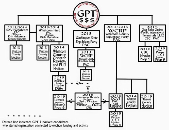 According to Common Threads Northwest’s March 3, 2015, registration with Washington state’s Secretary of State, the group’s listed directors were: Chet Dow, Larry Helm, and John Kirk (Kirk, presently is no longer listed as a director). Dick Donahue was listed as Chairman. Donahue, Dow and Helm are presently listed as governors for the organization. All three of them were the beneficiaries of expenditure advertising, via the SAVEWhatcom/Whatcom First affiliated PACs which had received a $10,000 cash campaign contribution from Gateway Pacific Terminal (GPT) applicant Pacific International Terminals (PIT), a subsidiary of SSA Marine, during the 2014 Whatcom County elections.