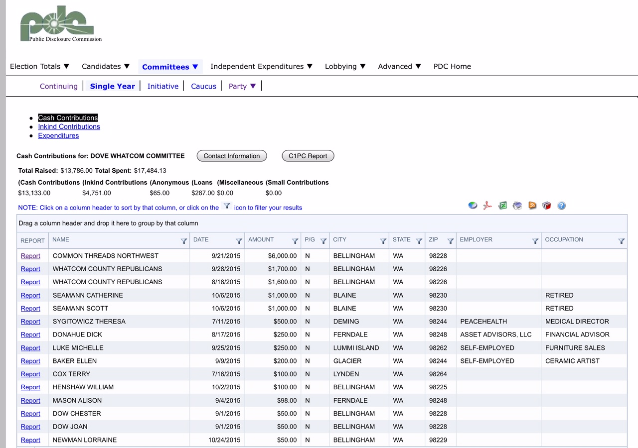 During the those 2015 Whatcom County elections, Common Threads Northwest had contributed $6,000 to the Dove Whatcom PAC. According to Washington state’s Public Disclosure Commission’s online filing records, and Dove Whatcom’s website, the Dove Whatcom PAC was created to support Prop 1 (district-only voting), and to support Props 2 and 3, mechanisms with which to potentially enable the locking-in of the district-only voting system indefinitely, while also opposing Props 9 (increasing Whatcom County from the then-three districts to five) and 10, during the 2015 election.
