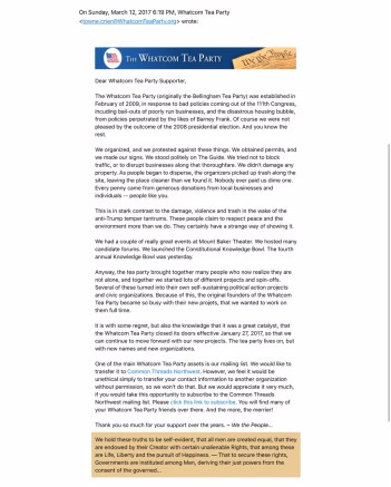 The Whatcom Tea Party is ostensibly defunct. A March 12, 2017, email newsletter sent by the Whatcom Tea Party’s “Town Crier,” to the group’s email mailing list subscribers, stated in part: