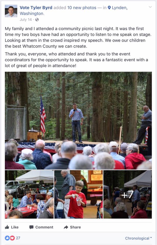 tyler bird at whatcom republicans picnic Published August 23, 2017 at 614 × 960 in You can run (for office), but you can’t hide: Documenting some nonpartisans’ partisanship / Facebook post, Sj Robson ← Previous Next →