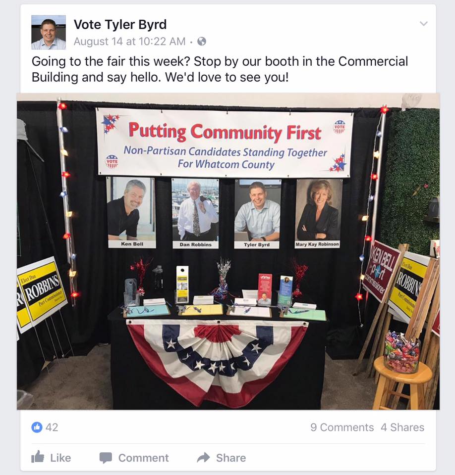 whatcom republicans at the fair booth Published August 23, 2017 at 918 × 960 in You can run (for office), but you can’t hide: Documenting some nonpartisans’ partisanship / Facebook post, Sj Robson ← Previous Next → Screenshot photo of August 14, 2017 Vote Tyler Byrd Facebook page post