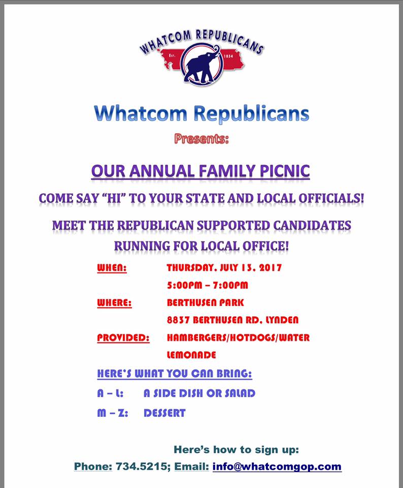 whatcom republicans picnic poster Published August 23, 2017 at 794 × 960 in You can run (for office), but you can’t hide: Documenting some nonpartisans’ partisanship / Facebook post, Sj Robson ← Previous Next →