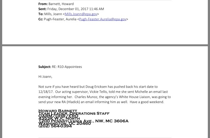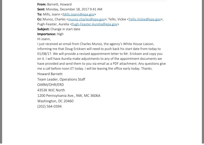 FOIA records show that in late November through mid-December of 2017, there were various internal EPA emails between staff who had been getting things in place for Ericksen’s initial expected start date of December 4, 2017, and after that start date was changed, they were readying for his secondary expected start date of December 18, 2017.