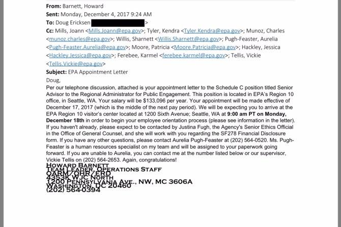 On December 4, 2017 (at 9:24 AM), Howard Barnett sent an email to Ericksen, and Ccd nine other individuals, with Ericksen’s attached appointment letter for his Schedule C position titled “Senior Adviser to Regional Administrator for Public Engagement,” to be located in the Region 10 office in Seattle.