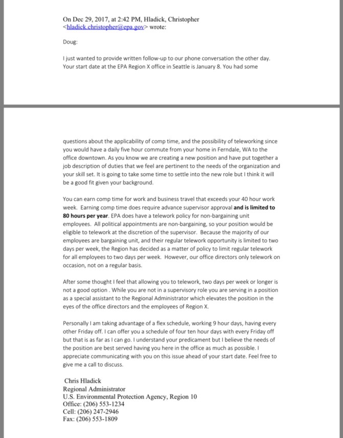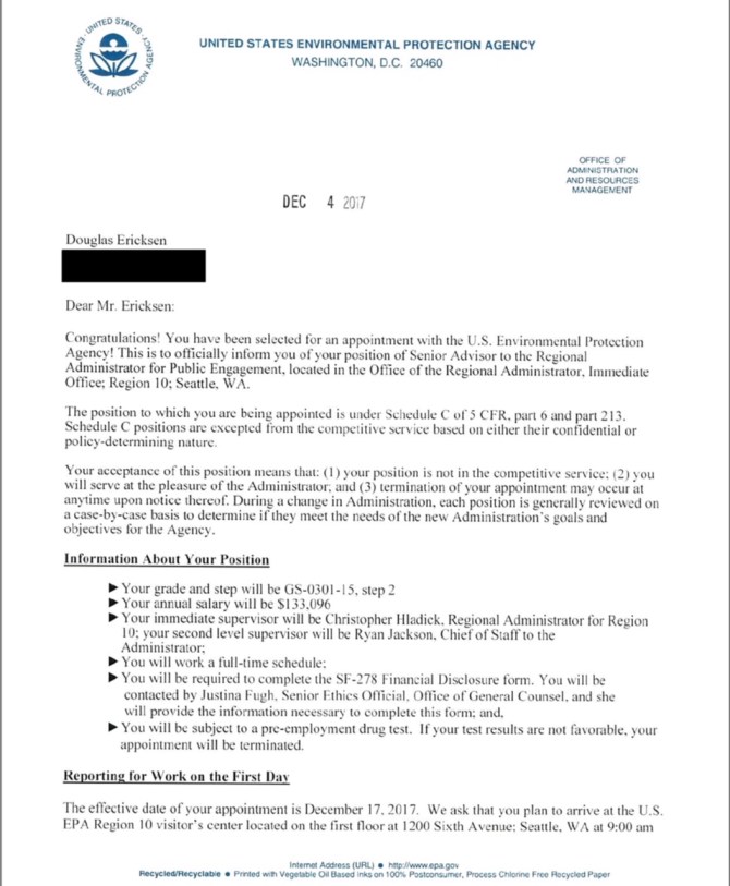 The 4-page appointment letter dated December 4, 2017, that was attached to Barnett’s email stated that Ericksen would work a full-time schedule, his immediate supervisor would be Regional Administrator Hladick, and his second level supervisor was to be Ryan Jackson, Chief of Staff to the Administrator of the EPA, Scott Pruitt. The letter further stated: “The Human Resources team in Seattle is prepared for your arrival and after you have been issued the oath of office, they will conduct your new employee orientation session.”