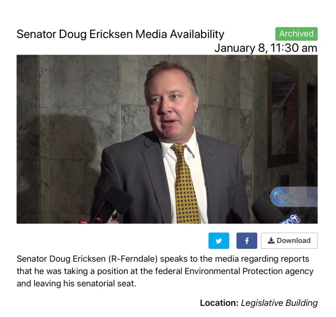 Ericksen also issued a January 8, 2018, press release which stated in part, “State Sen. Doug Ericksen R-Ferndale, said Monday he plans to remain in the Washington Legislature – and will not be taking a job with the federal Environmental Protection Agency, contrary to erroneous press reports published Friday and over the weekend.” Also, in the press release, Ericksen was quoted as having said: “Media stories printed last week and over the weekend were inaccurate.”