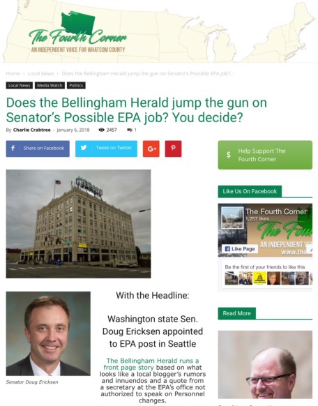 On January 6, 2018, Republican state Senator Douglas Ericksen found himself on the front page of The Bellingham Herald, and the subject of headlines in numerous other news publications later that day and over the weekend, for having been appointed to the position of senior adviser to the regional administrator in the Environmental Protection Agency’s Region 10 office, in Seattle, Washington. Ericksen tried to quash that news by saying the story was false, and by calling those press reports “erroneous.” Local reporter Kie Relyea, first broke the story on January 5, in the online version of The Bellingham Herald.