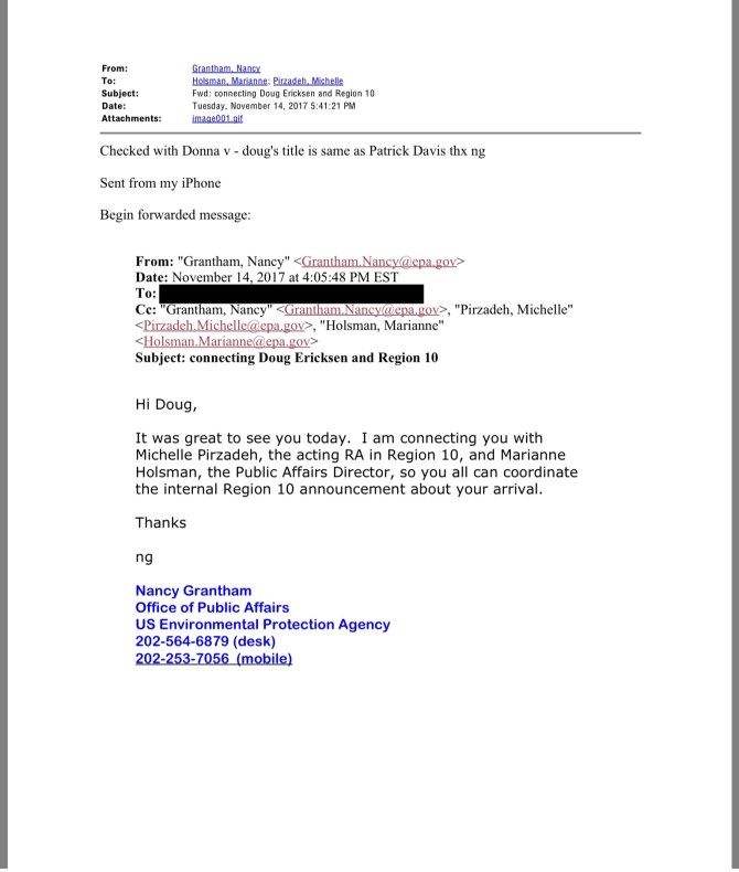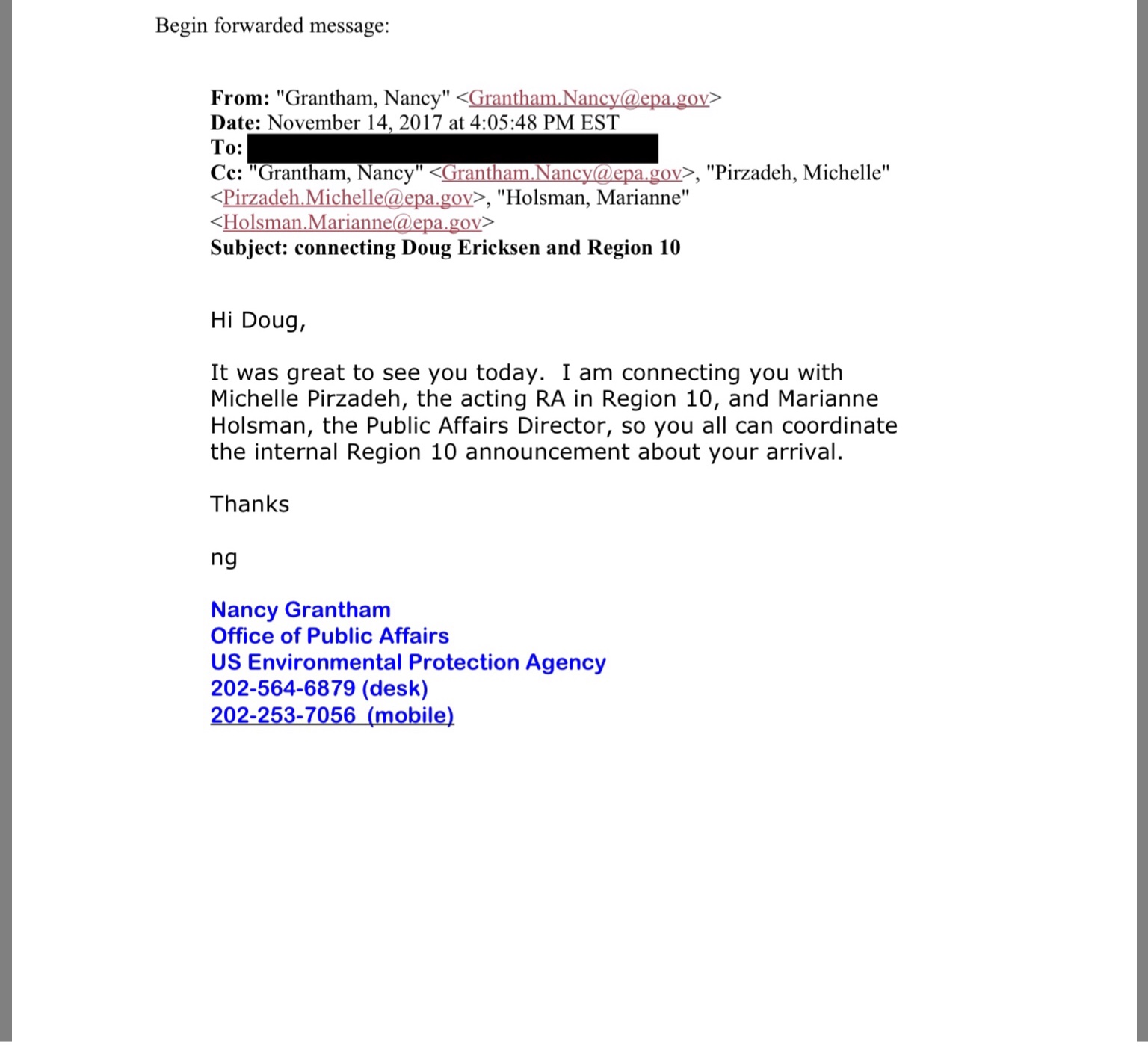 According to email communications obtained through FOIA records, it appears that Senator Ericksen met with EPA and/or White House officials on or around November 14, 2017. A November 14, 2017 email (sent at 4:05:48 PM EST) sent to Douglas Ericksen, from Nancy Grantham, Office of Public Affairs (OPA) at EPA Headquarters in D.C., shows that Ericksen had seen Grantham earlier that day at Headquarters (HQ), which indicates that there had been some kind of meeting between Ericksen and one or more EPA and/or White House officials regarding potential employment with the EPA. Grantham had Ccd EPA Region 10 Deputy Regional Administrator Michelle Pirzadeh, and Marianne Holsman, the Public Affairs Director for the EPA’s Region 10 office, on that email communication.