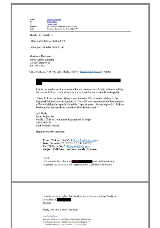 Records show a December 20, 2017 email sent (at 3:22:45 PST PM) from Linda Erikson, an administrative assistant in the office of regional administrator, to Jeff Philip, alerting him to my inquiry. Philip replied to her, the next day, December 21, 2017 (at 7:51 AM), and I believe he included Region 10 Public Affairs Director Holsman in that email reply, saying that he thinks they need to “craft a statement (verbal only)” that they could use when someone asks about Ericksen. Philip provided a suggested example which read: