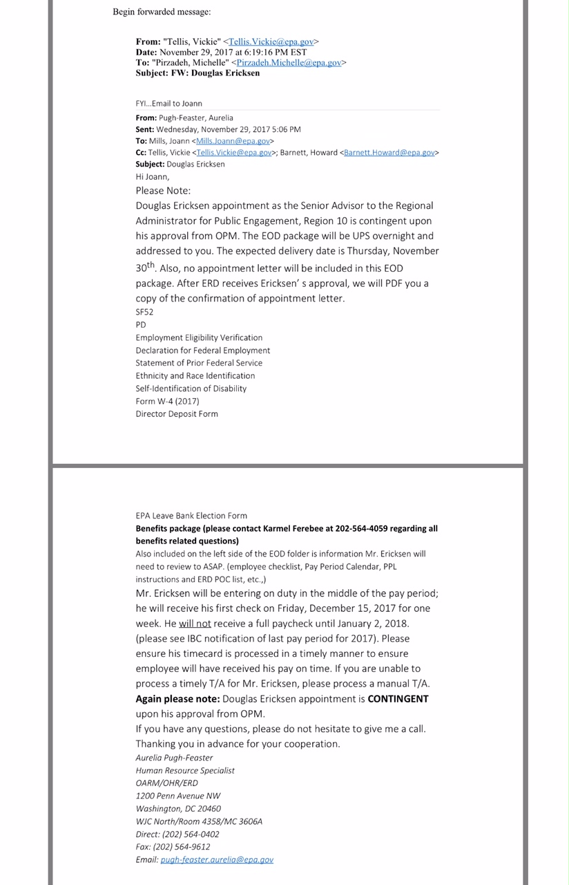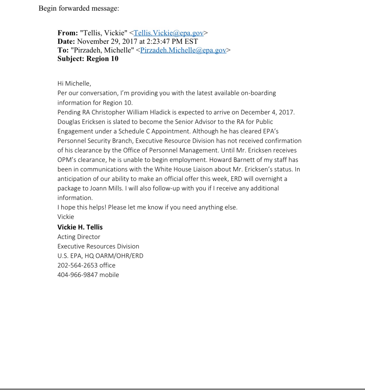 A November 29, 2017 email sent (at 2:23:47 PM EST) to Michelle Pirzadeh, from Vickie Tellis, then-Acting Director, Executive Resources Division, EPA HQ OARM/OHR/ERD, informing her that Ericksen “is slated to become the Senior Advisor to the RA [Regional Administrator] for Public Engagement under a Schedule C Appointment,” and that until Ericksen receives needed clearance by OPM, he could not yet begin his EPA employment. She said that they were anticipating making an official offer [written appointment letter] that week, and ERD was overnighting a package [needed paperwork] to Joann Mills in the Region 10 office.
