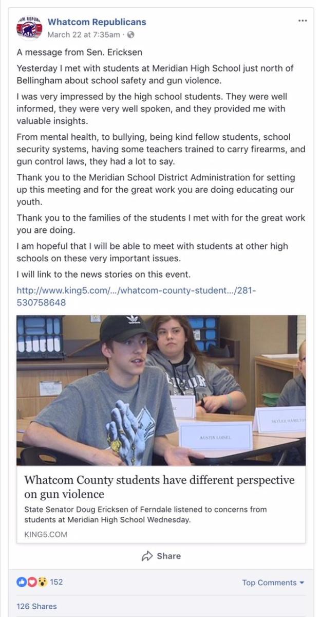 whatcom republicans message from sen ericksen Published March 25, 2018 at 664 × 1280 in Senator Ericksen’s meeting with high school students turns out to be publicity event / Noisy Waters Northwest, Sandy Robson ← Previous Next → Screenshot photo of the March 22, 2018, Whatcom Republicans Facebook page post about Senator Doug Ericksen’s March 21, 2018 visit to Meridian High School in Bellingham, Washington