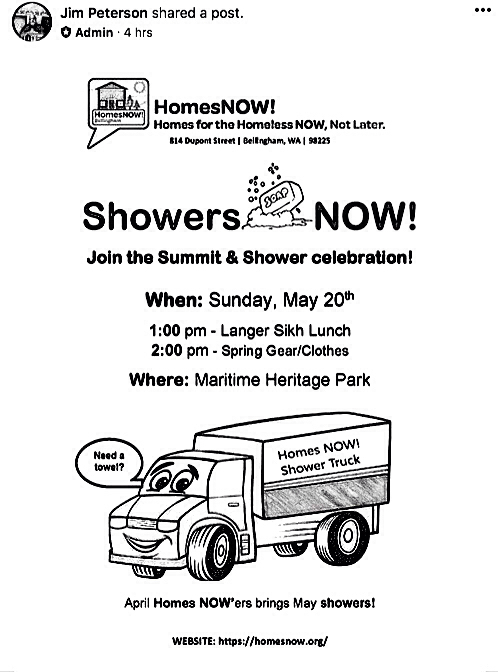Jim Peterson, president of HomesNOW!, posted another Facebook video at about noon today, Sunday, May 13. Jim has recorded what must seem like countless videos in his past busy year, steadily keeping Whatcom County informed on the many issues effecting members of our community who do not have houses.