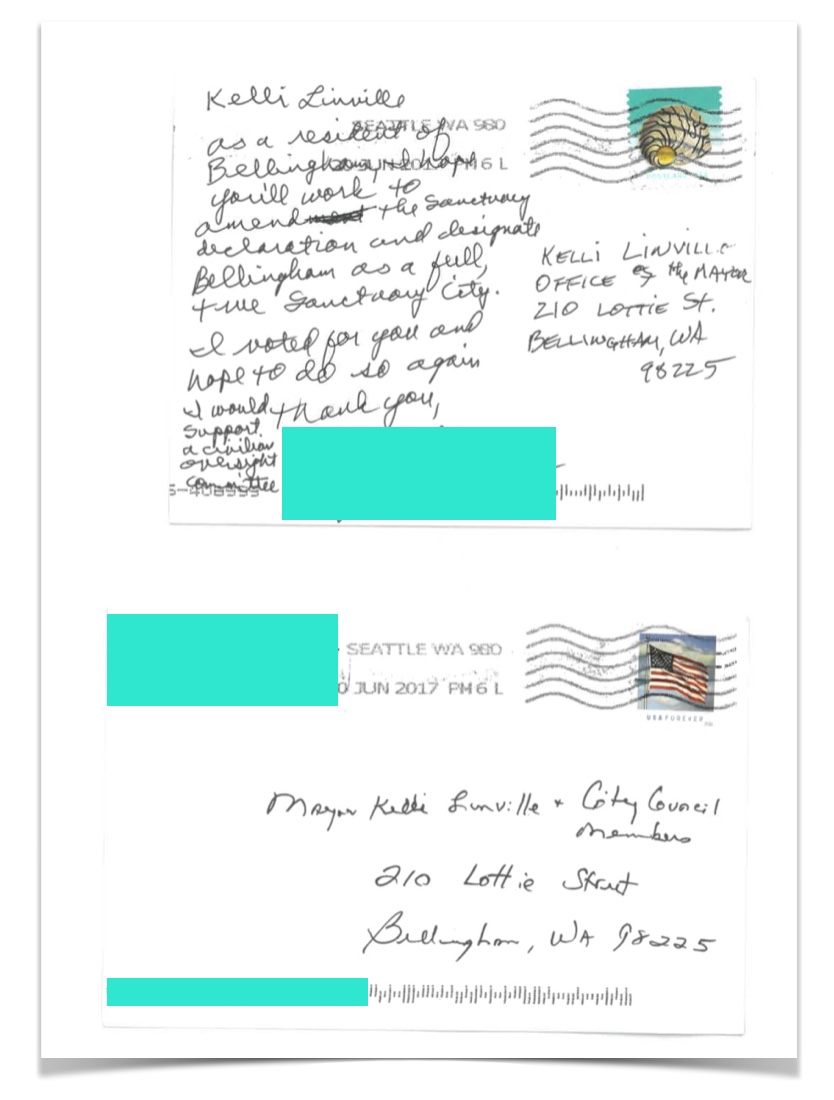 color postcards redacted 5 Published May 22, 2018 at 834 × 1100 in Overseeing the fight for civilian oversight to protect immigrants and people of color in Bellingham / Noisy Waters Northwest ← Previous Next → Click on any postcard to enlarge and page through other enlarged images