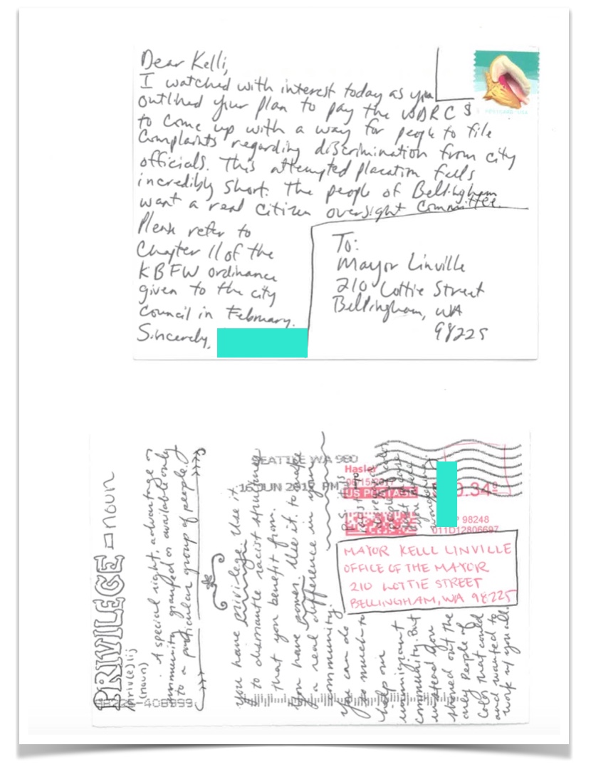 color postcards redacted 6 Published May 22, 2018 at 830 × 1084 in Overseeing the fight for civilian oversight to protect immigrants and people of color in Bellingham / Noisy Waters Northwest ← Previous Next → Click on any postcard to enlarge and page through other enlarged images