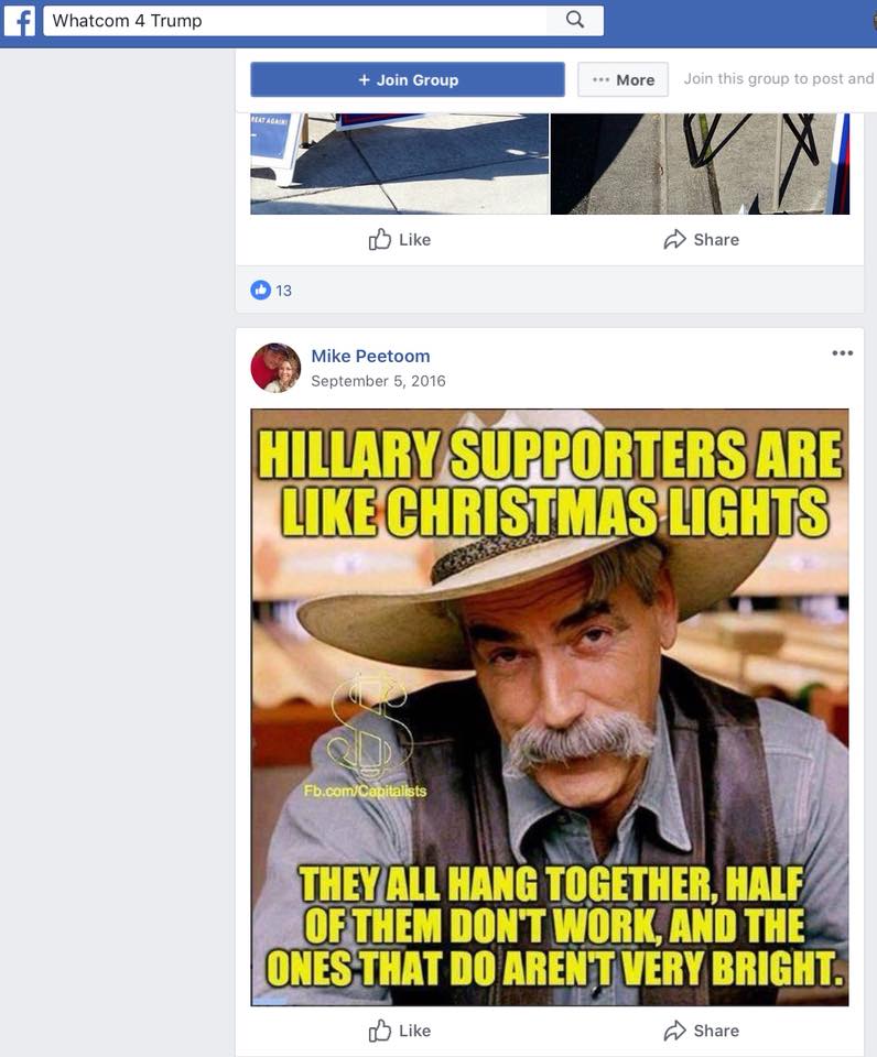 hillary supporters peetoom Published July 4, 2018 at 796 × 960 in Looking behind the campaign facade of Whatcom County Council candidate Mike Peetoom / Facebook post, Sj Robson ← Previous Next →
