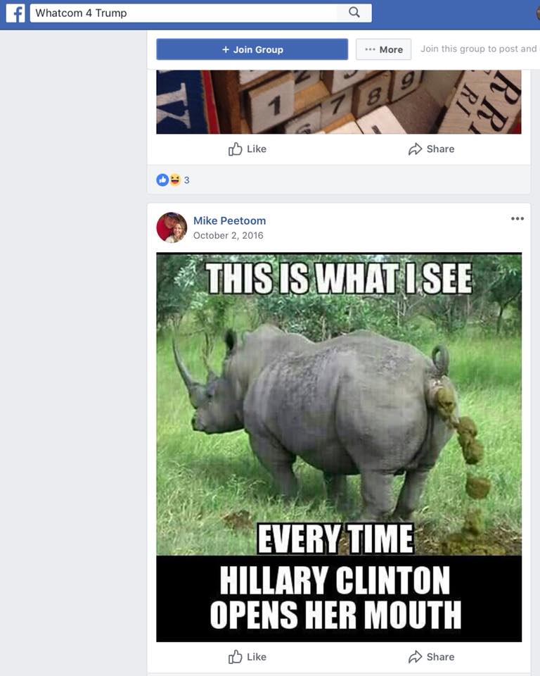rhino hillary peetoom Published July 4, 2018 at 768 × 960 in Looking behind the campaign facade of Whatcom County Council candidate Mike Peetoom / Facebook post, Sj Robson ← Previous Next →
