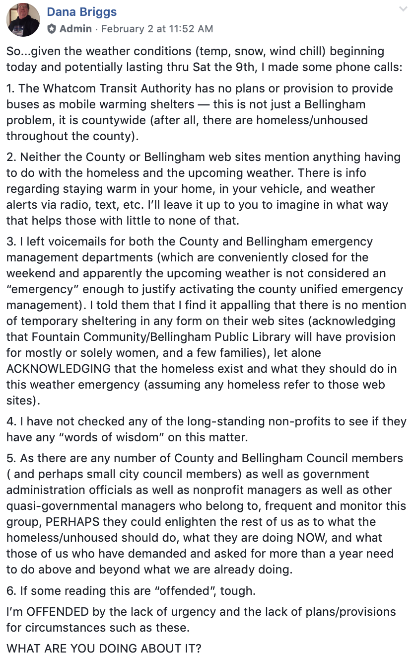 People were are also encouraging their friends and neighbors to call Mayor Linville at the City of Bellingham (360-778-8100 ) to demand warm places for people to stay overnight.