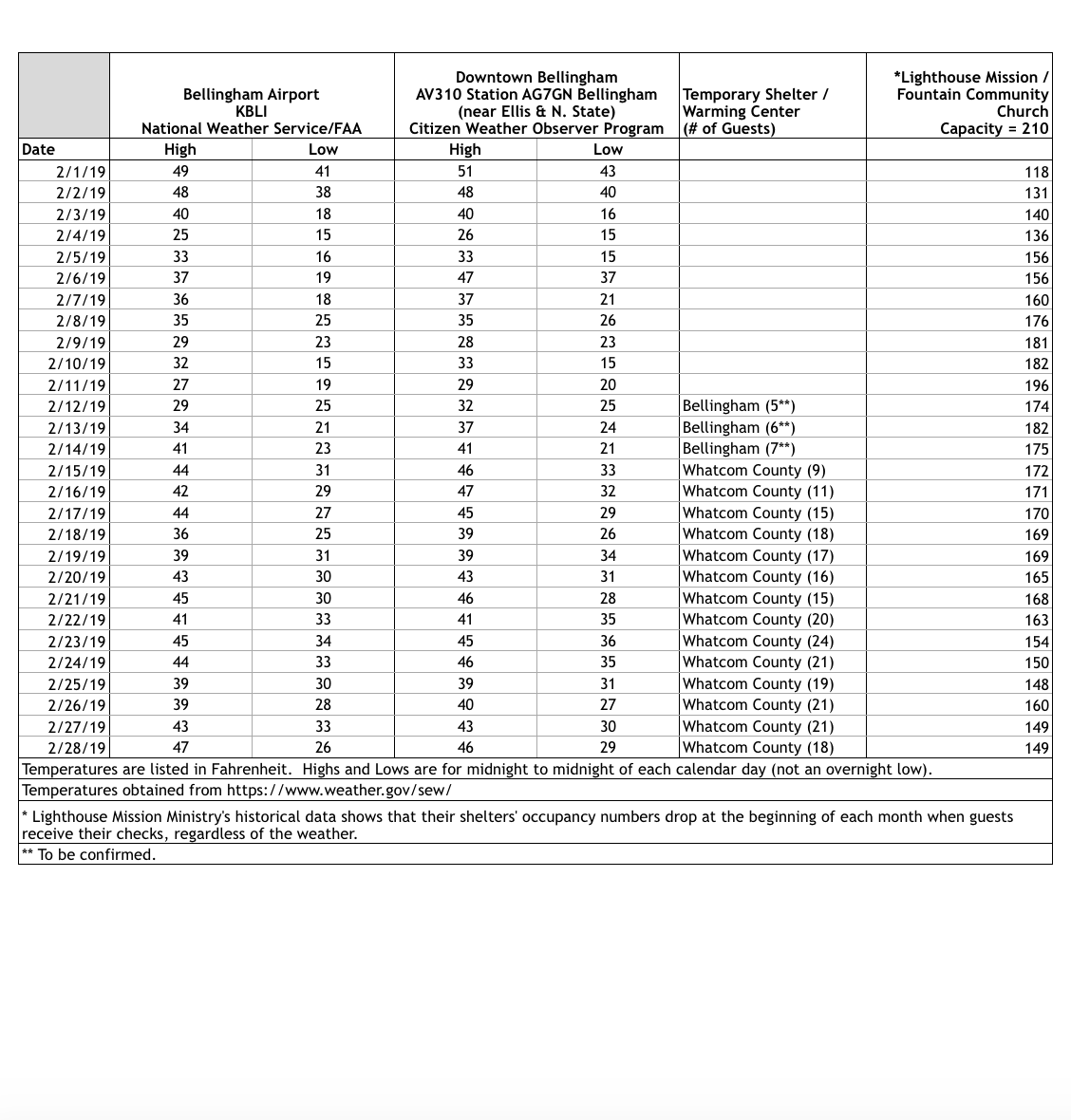 In the screenshots are a copy of the email I received yesterday from Bellingham Planning and Community Development Department’s Tara Sundin, and a spreadsheet from Deputy Executive Schroeder that I was forwarded and which had been made available to County Council Members. This is a spreadsheet that Whatcom County has been assembling, and which displays daily temperatures for February and March, along with numbers reflecting how many of Lighthouse Mission’s and Fountain Community Church’s available beds (up to 210) had been filled on each day for those two months of February and March 2019, according to reports made to the County by the Lighthouse Mission.