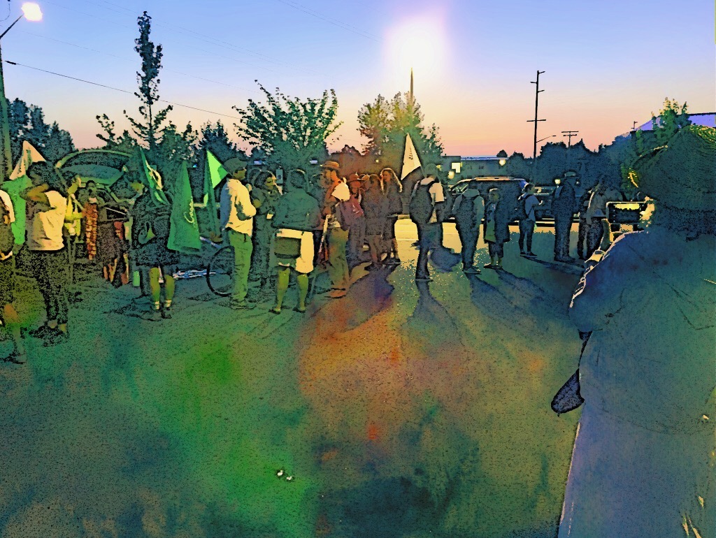 Then someone else stepped up to the bullhorn, a spirited organizer named Monika Atkins, who does her work, on the Climate Justice Alliance, for a just transition. Her focus is on the southeastern region of the United States where, among other things, she fights for dignity for workers. She spoke, led songs and chants, coaxing growing volume and commitment from the crowd as the sun was breaking past the horizon.