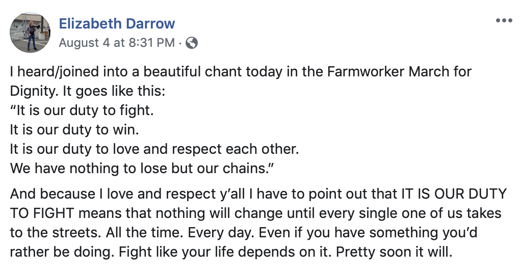 Crabtree had shown up at a picket by farm workers, community members, C2C, and FUJ, out at Crystal View Farm the year before, in August 2018, where the farm owner George Sandhu, according to his H-2A workers, had been withholding their wages and had been otherwise mistreating them by providing them with poor water and food.