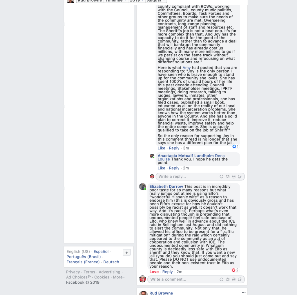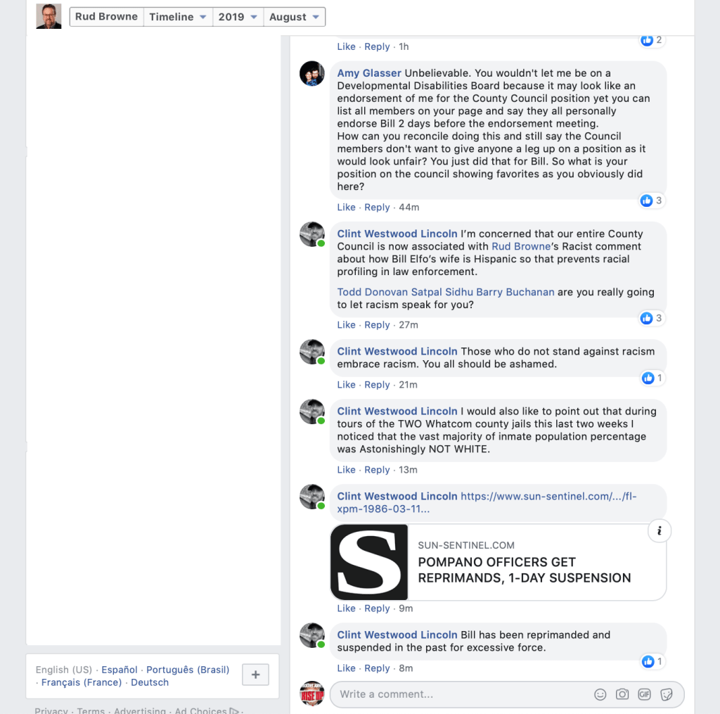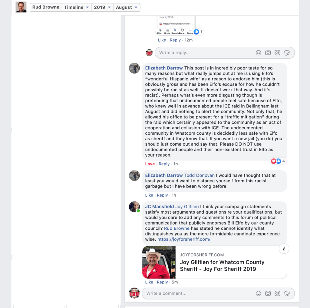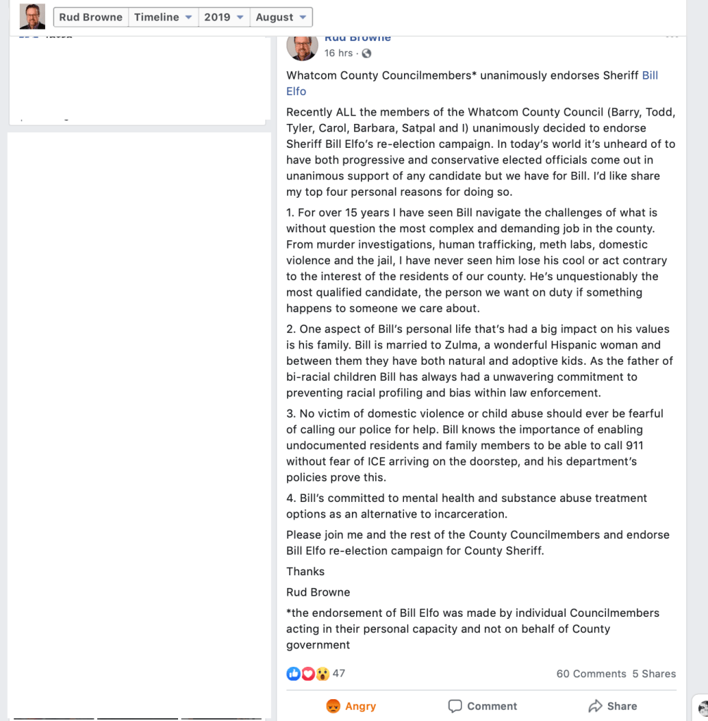 On August 20, 2019, Whatcom County Council Member Rud Browne made a Facebook post announcing that County Council Members “unanimously” endorse Whatcom County Sheriff Bill Elfo. That’s his right, but sad that he had to depict it with the initial appearance that Council Members somehow voted to do so. He indicates in a footnote, however, that they did not.