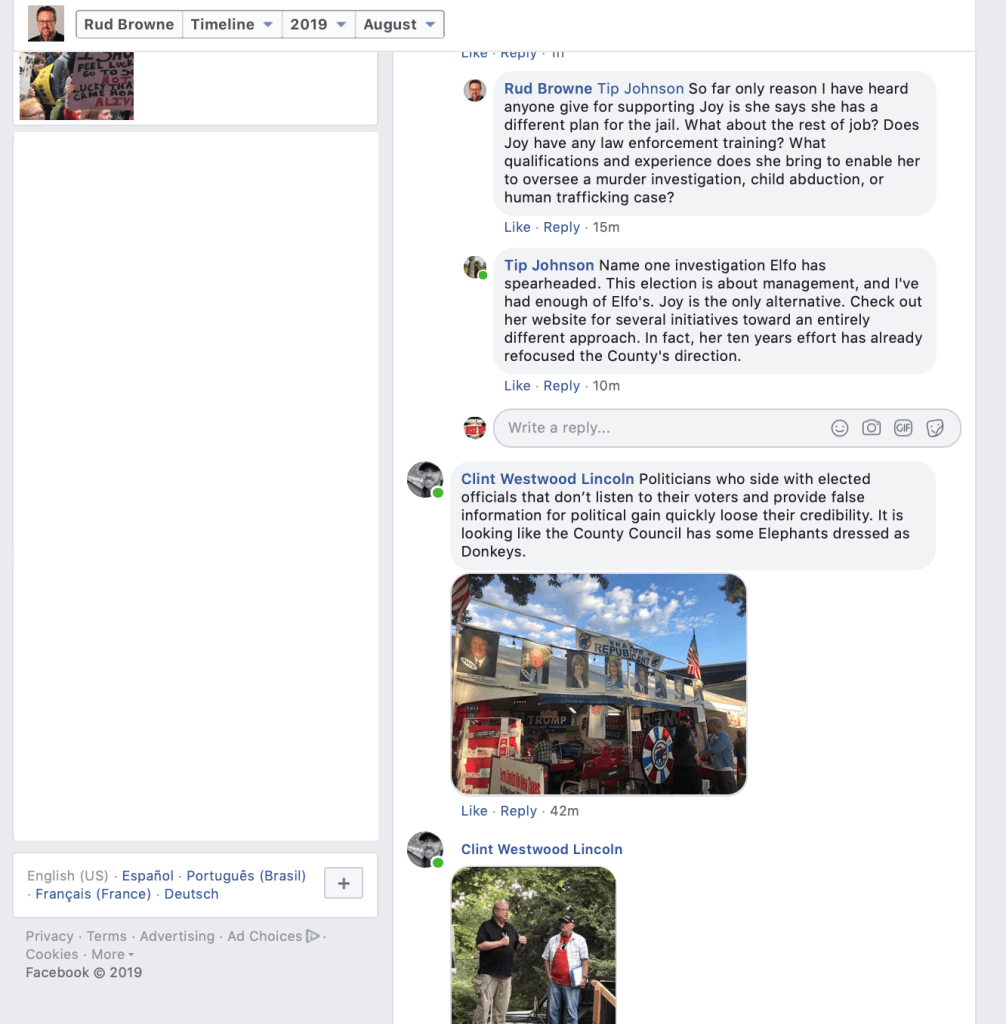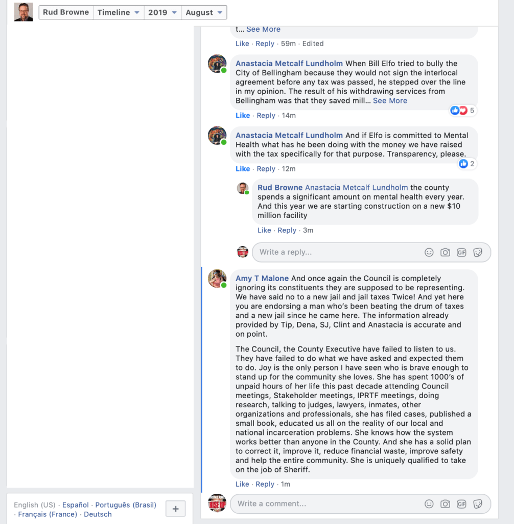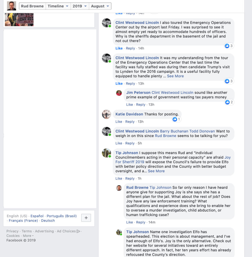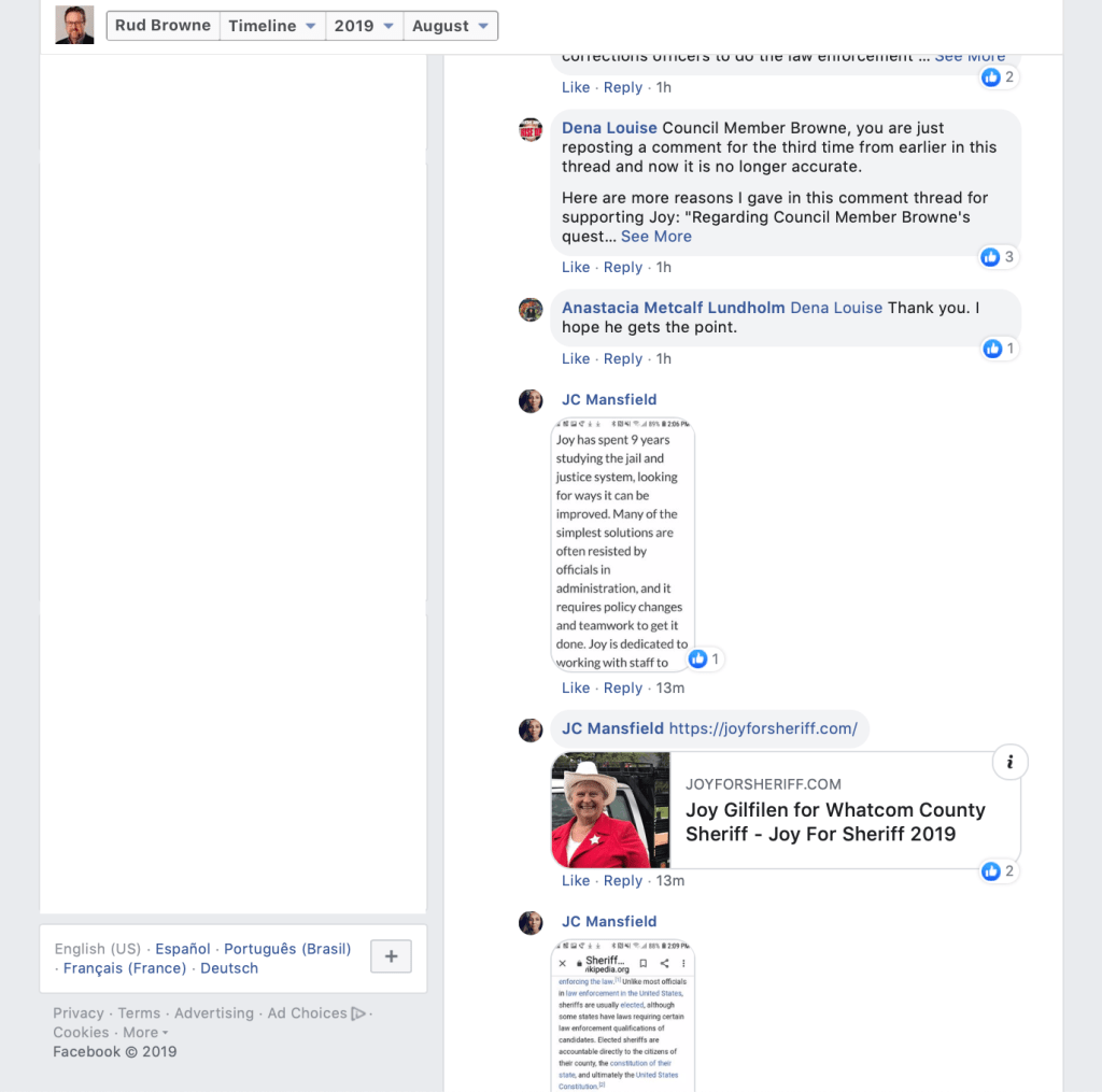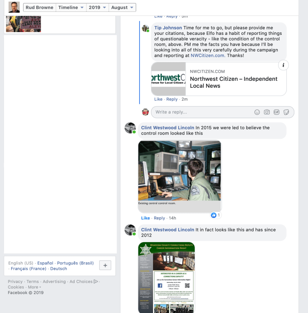 On August 20, 2019, Whatcom County Council Member Rud Browne made a Facebook post announcing that County Council Members “unanimously” endorse Whatcom County Sheriff Bill Elfo. That’s his right, but sad that he had to depict it with the initial appearance that Council Members somehow voted to do so. He indicates in a footnote, however, that they did not.